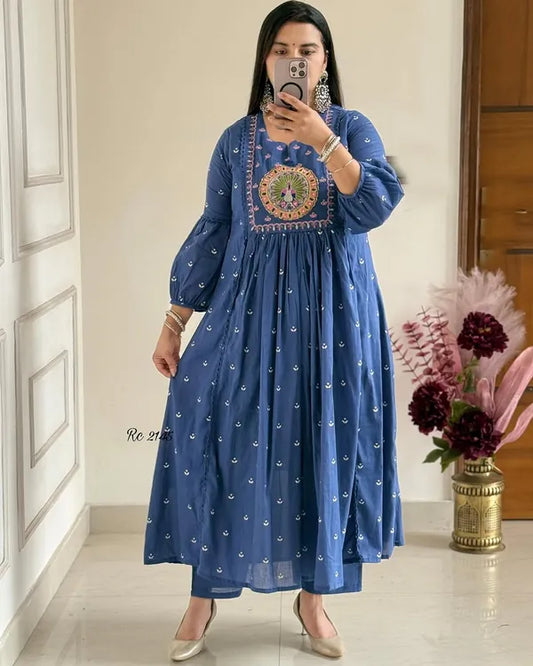 Blue Printed Design Fancy Attractive Kurta With Bottomwear Sets