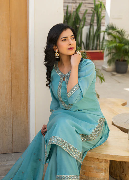 Blue Kurta And Pant With Dupatta Set For Women'S