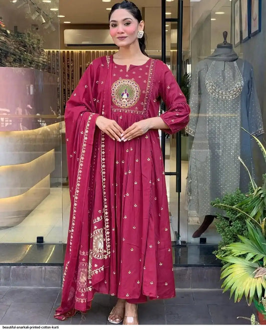 Pink Peacock Cotton Printed Anarkali And Pant With Dupatta Set ( Pink )